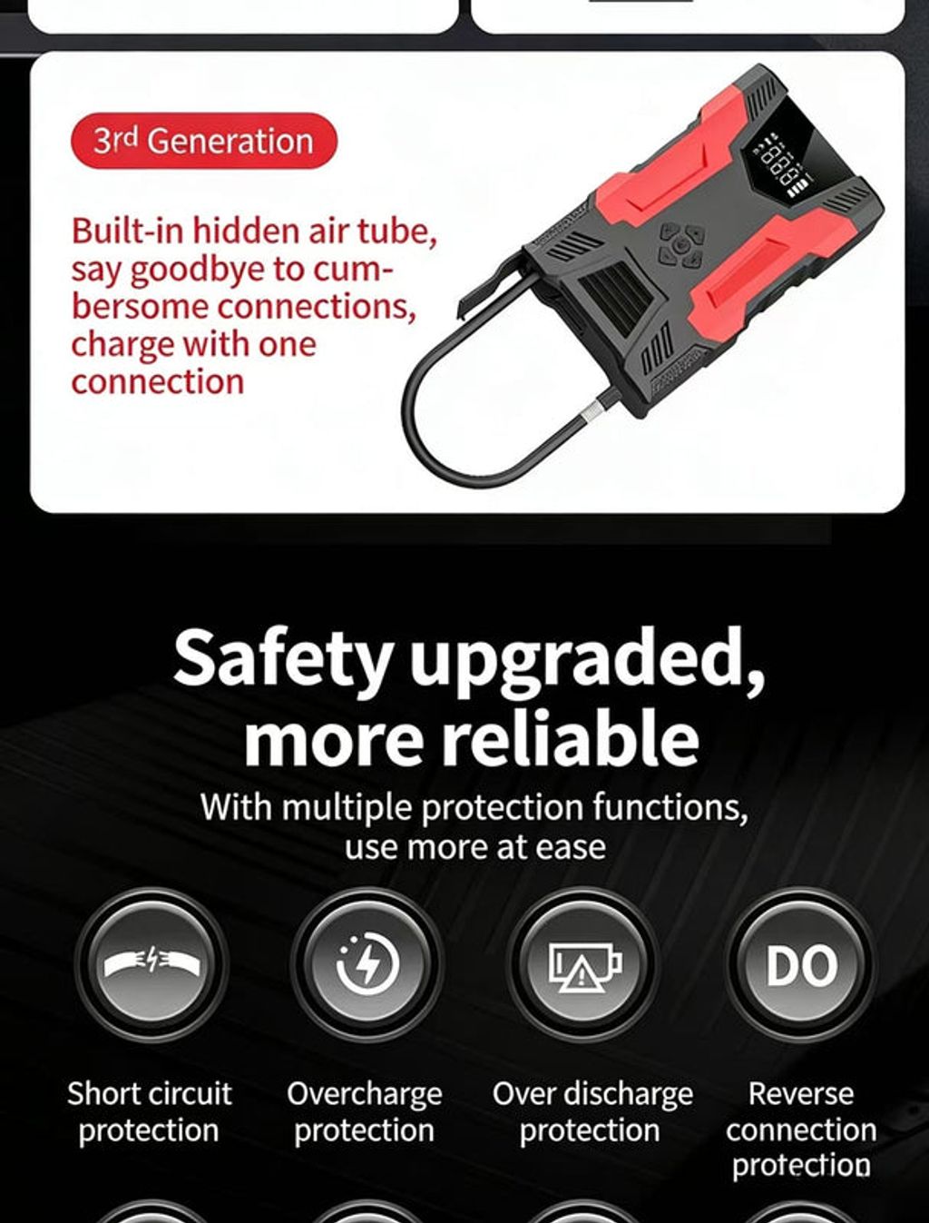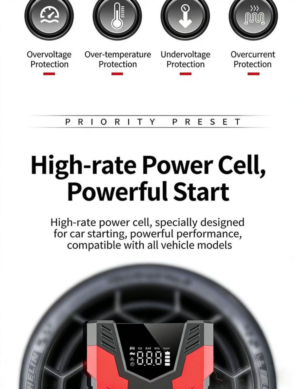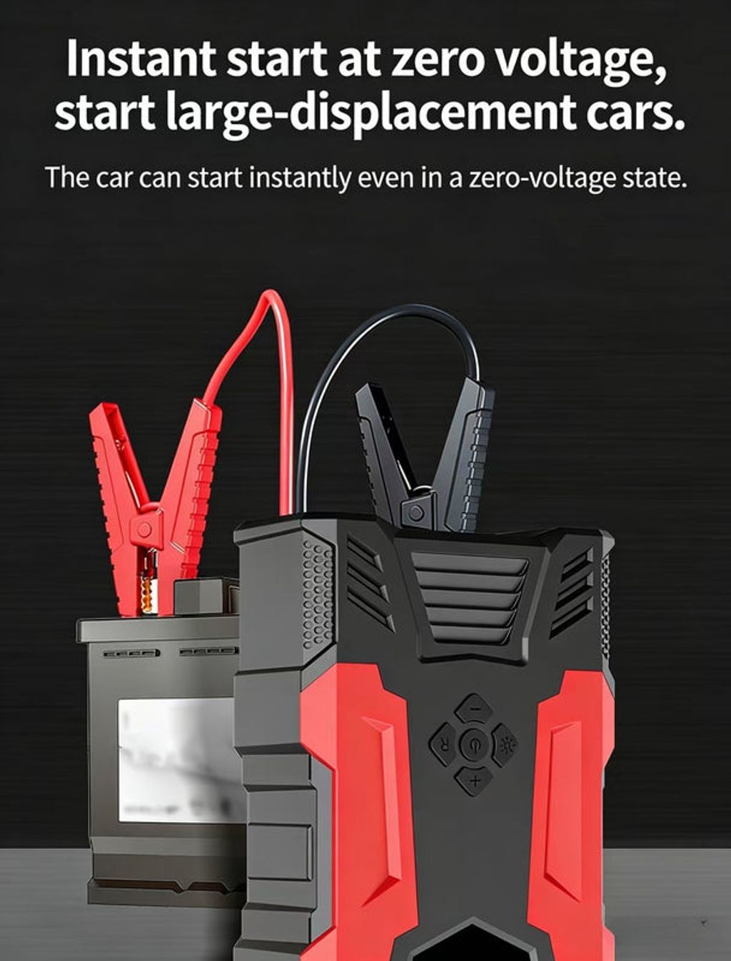 • Emergency Jump Start: 60C high-rate battery cell, 600A start current, 2000A peak current, instantly starts large-displacement 12V vehicles even at zero voltage